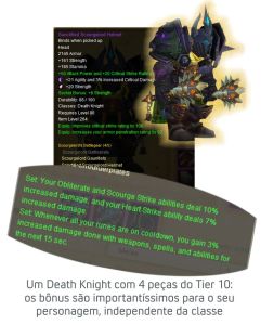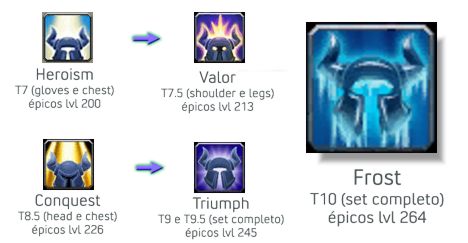 d) O que são Tiers ? Digamos que Tier é um tipo de gear diferente das demais. Cada classe tem seu set de Tier e ele dá 2 bônus para quem os usa: o de 2 e o de 4 peças. Quando se usa, pelo menos, 2 peças do Tier você ativa o bônus 2p dele. O mesmo vale para as 4 peças. A grande vantagem de se usar o Tier é o bônus. Como apenas 4 peças bastam para ativar os 2 bônus dele, é indicado que a 5a peça pega não seja Tier, pois essa peça extra, que é vendida no mesmo NPC que vende o Tier, geralmente é melhor do que sua correspondente no Tier. Os bônus do tier melhoram algumas habilidades de sua classe, seja com aumento de dano, armor, etc. Existem tiers para cada tipo de papel que você desempenhe: healer, tank ou dps. O tier a ser comprado com emblemas de Frost é o 10;