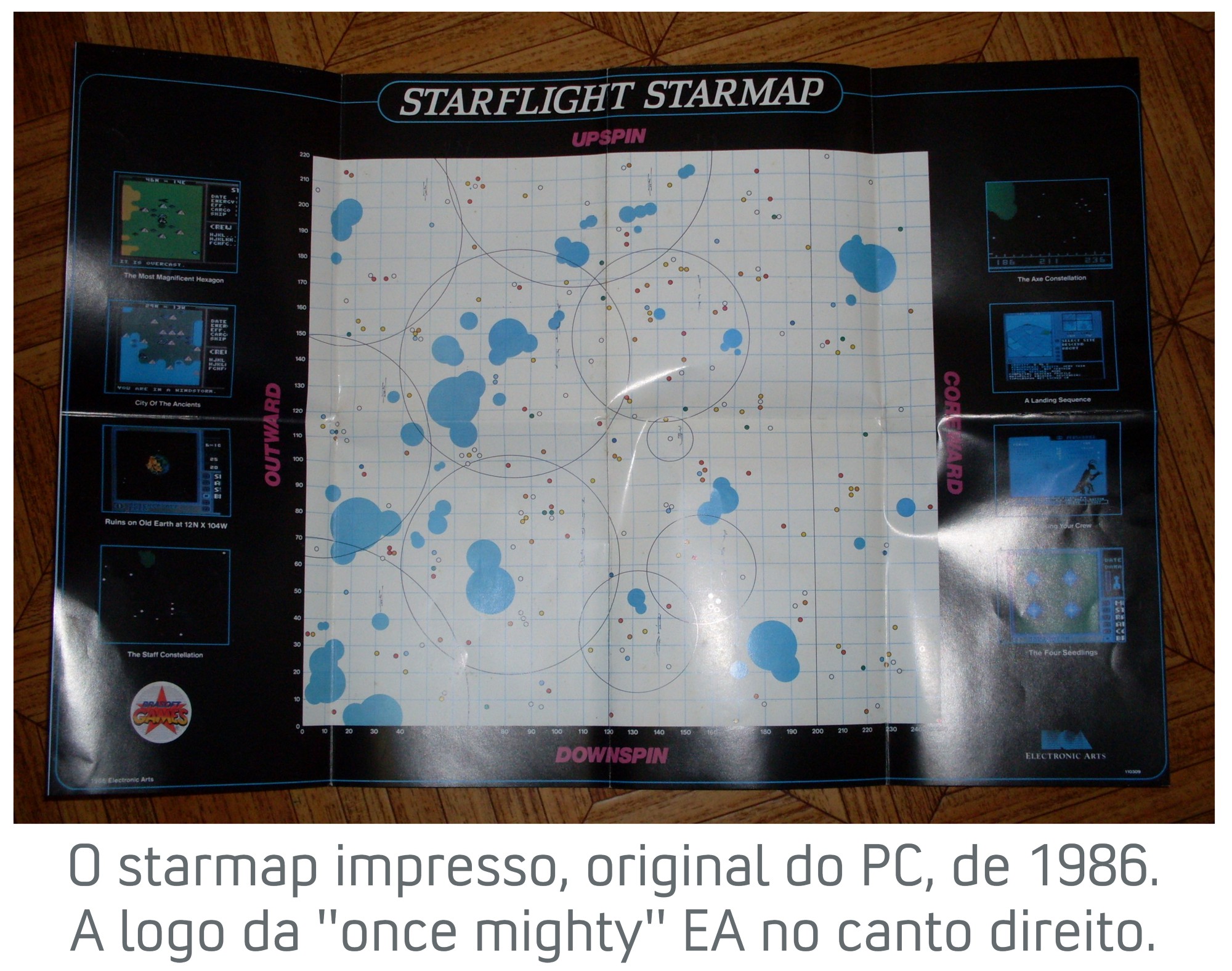 Enquanto não colecionava videogames, guardei este cartucho do Mega Drive embaladíssimo nas minhas gavetas de roupas, durante os últimos 18 anos, imaginem só. A versão para PC comprei por acidente em 1995, (9 anos depois do lançamento de Starflight original, portanto) numa feira de Informática aqui da cidade. No último dia, perto de fechar, um stand vendia jogos “para CD-ROM multimídia” e, perdido entre os Wing Commanders & X-Wings da vida, adventures da LucasArts e aqueles FMVs da época, estava lá: Starflight para PC, original, da brazuca Brasoft. Mas a caixa é importada, original mesmo, apenas tem o selinho da Brasoft colado. A vendedora, que estava descalça (sim, lembro deste detalhe, pois já estavam desarmando os stands — era final de feira) me vendeu por 20 reais. Dois floppies de 360k (dois disquetes de 5 e 1/4 de dupla densidade continham 6 meses de aventura), o manual, o code wheel para a proteção anti-cópia (moda na época) e… o starmap!