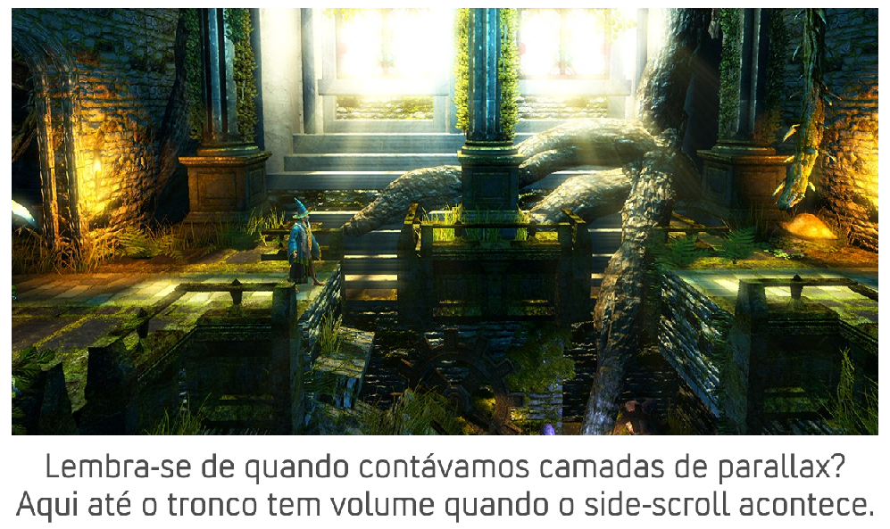 Trine é assim: bem moderninho, mas o gameplay é basicamente o bom e velho side-scroller com uma pitada de beat’em up.
