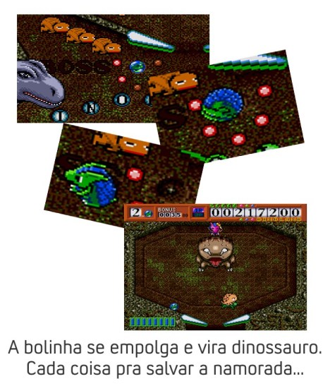 Dino Land é um destes exemplares. Esquecido no Mega Drive (e logo ofuscado por Devil’s Crash), o primeiro pinball para o 16-bit da SEGA foi produzido pela Wolf Team – famosa entre os amantes deste console – e trouxe o charme de uma historinha para o campo de jogo: um casal de dinossauros pequenos vivia feliz até um dinossauro grande raptar a fêmea (a dinossaurinha rosa); seu personagem, o namorado, vai resgatá-la. Ainda bem que o rapaz pode se transformar exatamente numa bolinha de pinball, porque o campo de batalha conta com os elementos típicos dos fliperamas.
