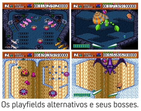São três campos de jogo: terra, representando o playfield principal; água e ar são os dois outros cenários, além de uma tela com um boss distinto em cada um deles. O acesso a cada cenário é conseguido quando o jogador completa alguma “quest” no playfield: por exemplo, para lutar com o boss na terra, você precisa acertar seu dino-bola numa trava, 6 vezes, sem perder vida no processo. Quando o jogador consegue, ele vira dinossauro e sai da tela principal. As lutas são legais e fulminantes: não há scroll, você controla os dois flippers e pode se transformar em dinossauro por alguns instantes para “atacar” o ajudante do chefão. Quando ainda não se conhece o jogo, a luta não costuma durar nem 1 segundo: isso porque a bola começa no seu flipper esquerdo e, no reflexo, você o aciona mandando o dino direto no boss que o rebate para a caçapa…