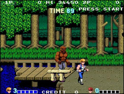Poderia ficar horas falando sobre Double Dragon, que é o meu jogo do coração e um dos mais brilhantes dos arcades nos anos 80. A música e os detalhes do cenário foram só alguns dos elementos que me deixaram louco. Anteriormente mencionei que nunca joguei The Legend of Kage nos fliperamas por achar difícil. Engraçado que quando conheci o Double Dragon, também tive medo de jogar, mas fiquei tão deslumbrado, que fui comprando fichas e treinando, até me tornar um verdadeiro mestre. Zerava Double Dragon sem perder vidas. A terceira fase do Double Dragon é clássica e se passa em uma floresta, com direito a árvores cortadas. Já na sequência, Double Dragon II, uma tora de árvore torna-se um dos objetos que podemos pegar para arremessar nos inimigos. Pequenos detalhes que a gente não esquece.