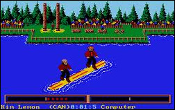 World Games (Jogos Mundiais) é um curioso conjunto aleatório de jogos que fazem sucesso em vários cantos do mundo. São 10 modalidades que vão desde Salto com varas e Sumô, até Esqui e Salto sobre barris. E uma das modalidades é a de rolar em cima de um tronco sobre a água (log rolling) a fim de derrubar seu oponente (vide screenshot). O esporte não é conhecido por aqui, mas já assisti pela ESPN uma vez, quando a emissora transmitiu uma competição mundial de lenhadores (ou coisa do tipo). As dez modalidades do World Games são: Salto sobre barris (Barrel jumping), Montaria em touro (Bull riding); Cabo de guerra (Caber toss); Salto de penhasco (Cliff diving); Rolamento no tronco (Log rolling); Salto de plataforma (Platform diving); Salto com varas (Pole vault); Esqui (Skiing); Sumô (Sumo wrestling) e Levantamento de peso (Weightlifting). Outra curiosidade é que o game foi lançado para uma penca de plataformas, como mostra acima. Só o conheci no MSX.