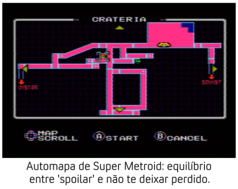 Por fim, o mapa de Prime, que se apresenta como um modelo vazado em 3D muito bonito, torna-se confuso em muitos momentos; Super Metroid, com seu automapa em glorioso 2D, é como um mapa que a gente desenhava no caderninho de mapas e passwords que nos acompanhava antigamente… parece que foi você mesmo quem fez! :)