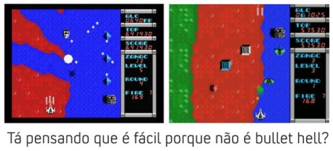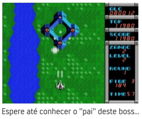 Em Zanac controlamos uma nave durante oito fases. Ela é equipada com tiros normais e armas extras, que são obtidos ao destruirmos determinados inimigos durante a partida. Reza a lenda que o jogo tem um sistema de inteligência artificial que adapta os padrões de ataque inimigos às armas que estamos usando e ao tempo que passamos sem morrer, tornando o jogo mais fácil ou difícil. Daí o “A.I.” que existe logo abaixo do título do game exibido na abertura. Na época, não fazia idéia do significado do acrônimo – somente anos mais tarde, graças ao nosso querido oráculo moderno (a.k.a. Google). Apesar dos vários relatos, nunca consegui notar essa tal inteligência artificial do jogo. Talvez seja porque eu tendia a jogar sempre com a mesma combinação de armas: três tiros normais + arma especial número quatro (as esferas girando ao redor da nave). Esta combinação de armas apareceu novamente anos depois num certo jogo indie baiano :-)