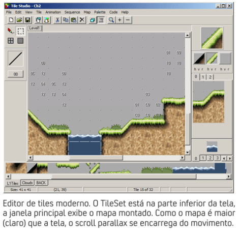 Mas, a parte artística mais complexa do jogo foi, de longe, o mapa. Lembram que eu falei sobre tilling no post sobre Zanac, sobre o trabalhão que dá fazer aquilo? Pois bem, um grande companheiro de faculdade, Andrey Santana (não é o do Cosmic Effect) deu uma ajuda e tanto. No CDX, havia uma amostra de como fazer tilling, inclusive com um mapa pronto que exibia até mesmo parallax vertical. Tudo que precisava estava lá, naquele exemplo.